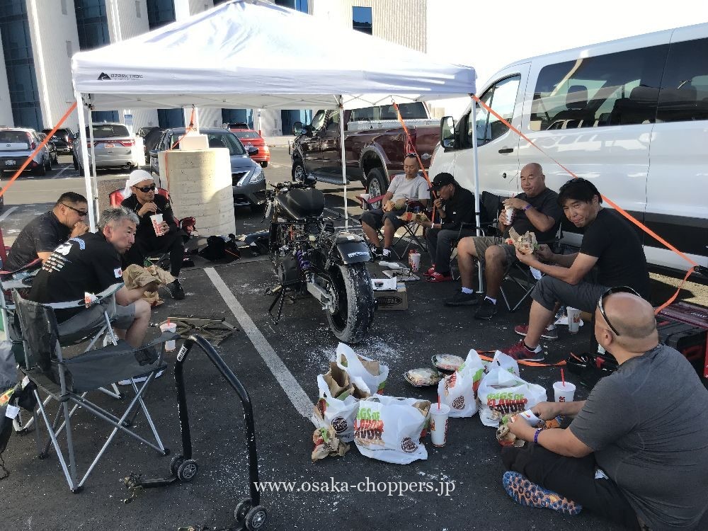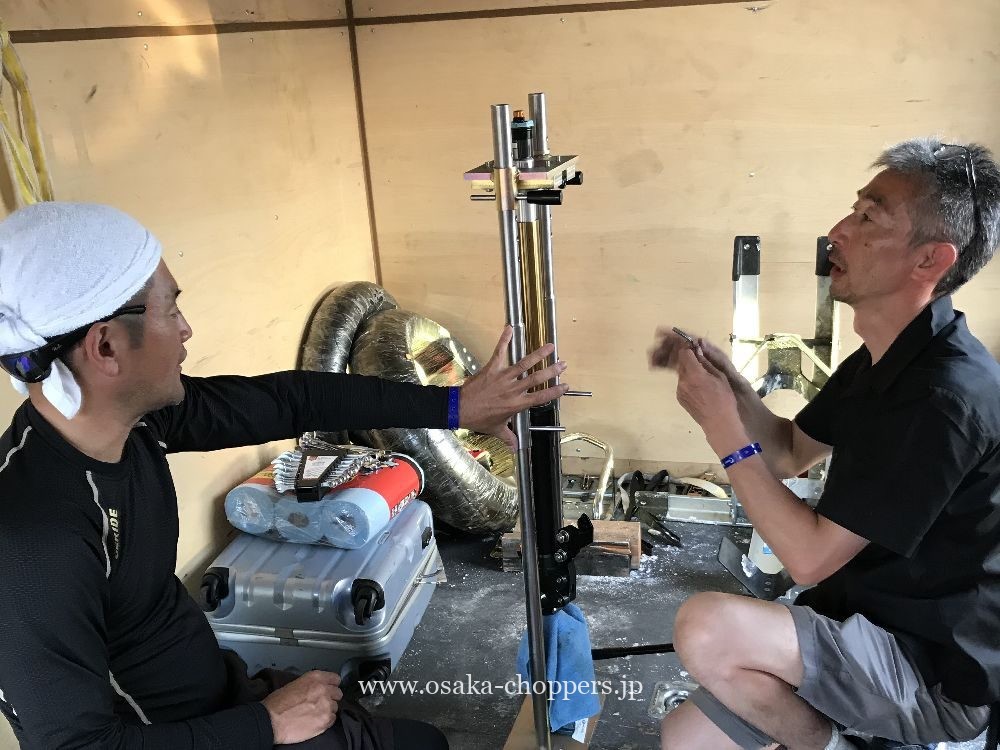 夜はホテルの駐車場で各部の点検とサスのセッティング