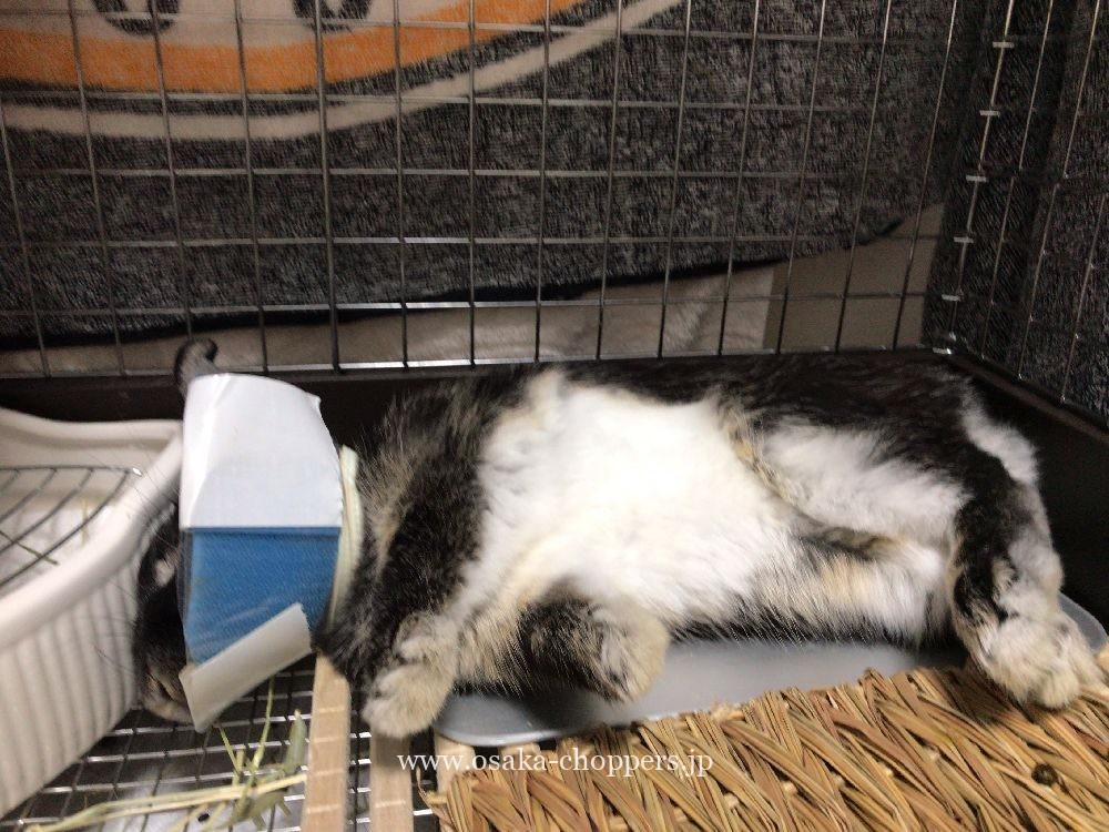 迎えに行くとエリザベスカラーとかいうエリマキトカゲみたいなものが装着されてました(術後のお腹を触らないように)