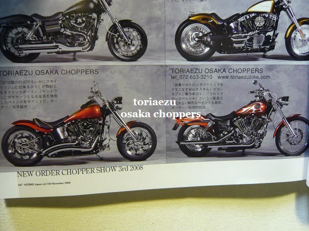 HOT BIKE 104 Posted on 2008年9月27日2016年12月1日 by sumikawa ホットバイク今月号にこの前のチョッパーショーの写真が載っています。 左の車両VONDUTCH-FLYING DUCHMANはFOR SALEです。興味とお金のある方どうですか? 右側、FLSTFとFXDWGは最近よくツーリングに行かれてるので見かける機会もあると思います。生で観て下さい、かなり綺麗ですよ(^^) Post navigation ← 甲子園球場 2008.9.24 阪神VS横浜’05 FXSTB カスタム →