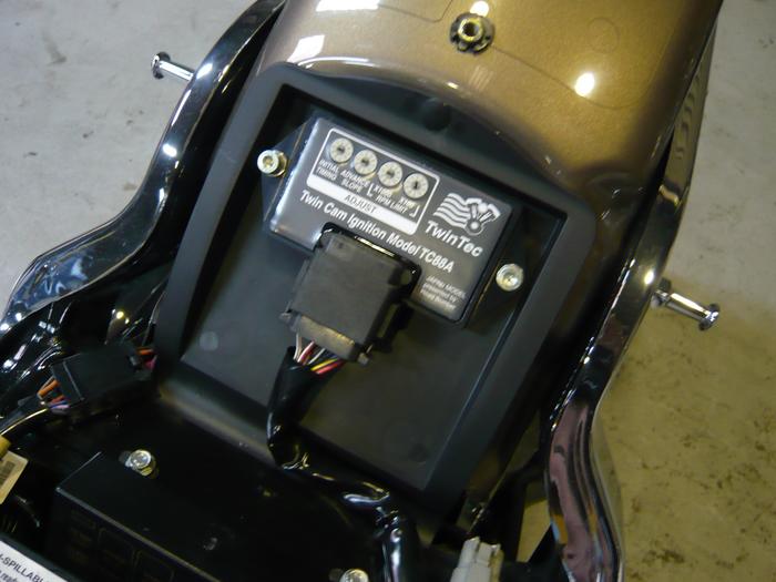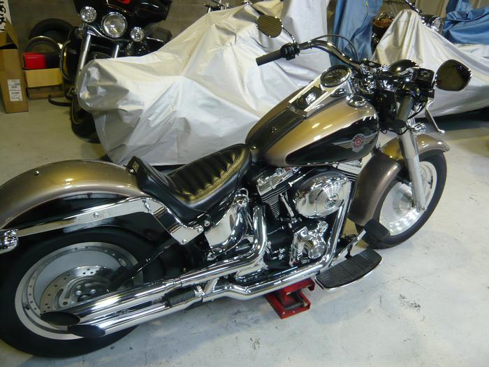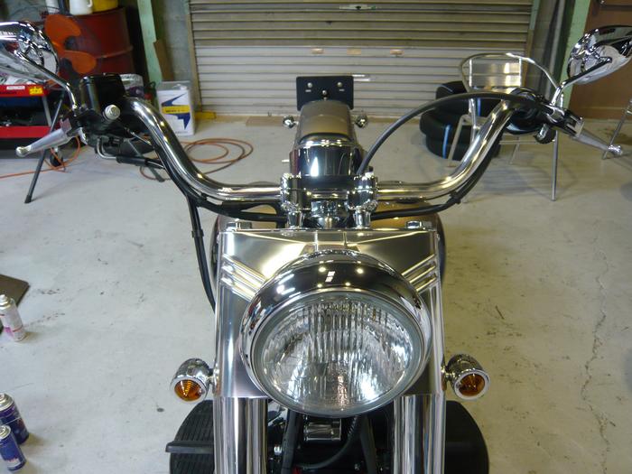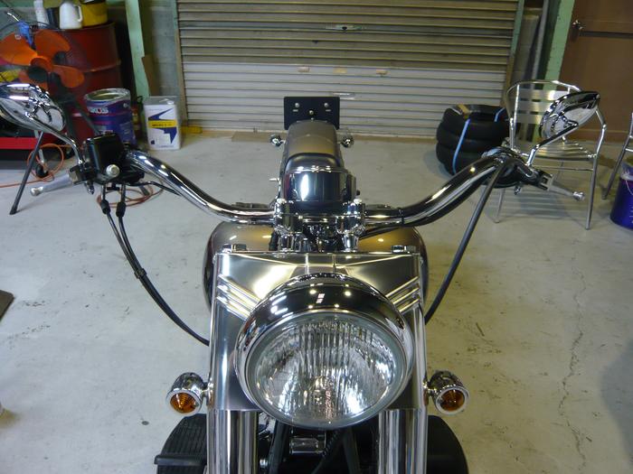 ’04 FLSTF カスタム Posted on 2008年5月10日2016年12月1日 by sumikawa 森野さん、こんな感じです。 今回は、ハンドル交換とツインテック化なんでサクッと終了しました(^^) befor after 丁度こぶし1個分ぐらい下がった感じで幅はほとんど同じかな・・ ケーブル類もそのままいけましたよ。 ツインカムは回転数を落とすとエンジンが止まりますが、’04モデルの初期モデルはその中でも特別止まりやすいです。800回転ぐらいで確実に止まります。(’04途中でモジュールの品番が変わってます。)が、しかし、ツインテックでそんな問題は一撃です。今回もまた3拍子奏でてます(^^)V Post navigation ← Mr ASAMURA’01 FLHR 車検、カスタム →