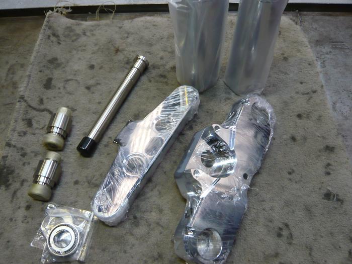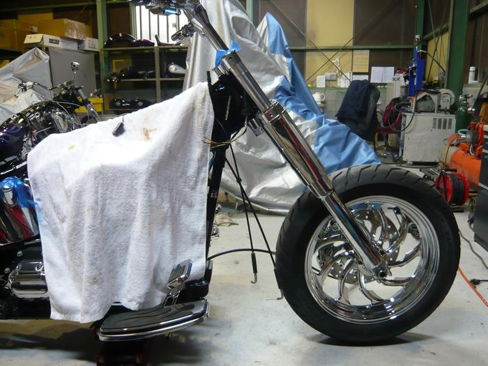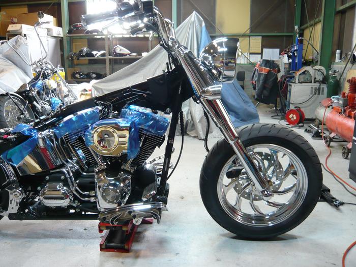 なかなかヘリテイジやファットボーイで純正ナセルを使ってレイク角を変えている方はいないです。今回はさらにハンドルまわりもおなじみパフォーマンスマシーンでバスッといきます。